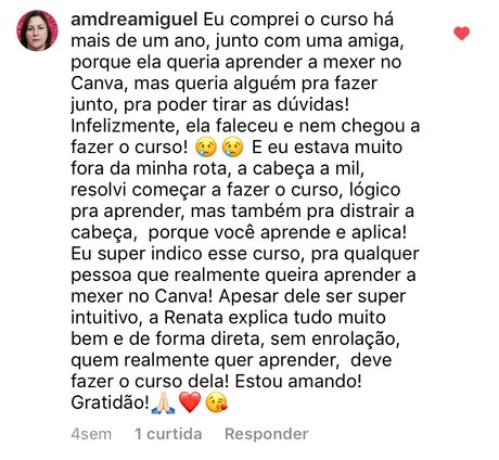 Através do curso do Canva, instruído pela querida Renata Massa, pude aprimorar muito mais minhas redes sociais, pois sou terapeuta, e trabalho muito com a imagem visual dos meus pacientes.